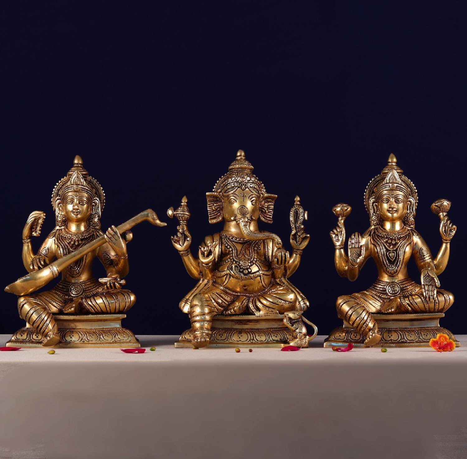 Includes Lord Ganesha, Goddess Lakshmi, and Goddess Saraswati together.