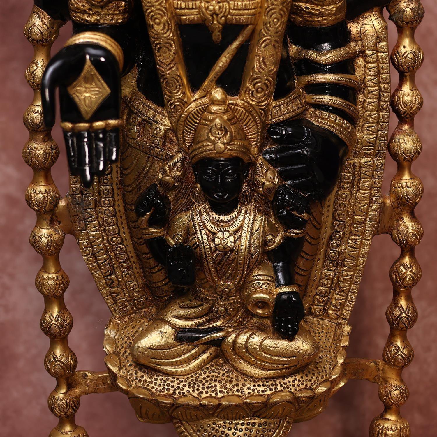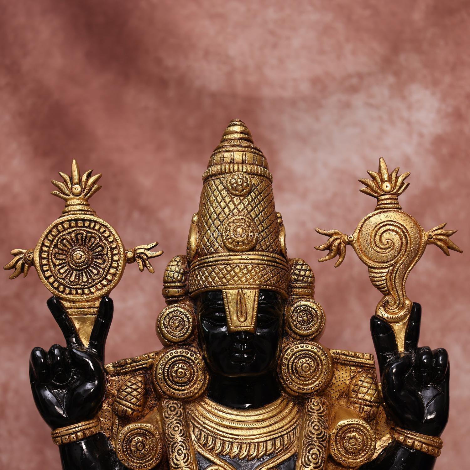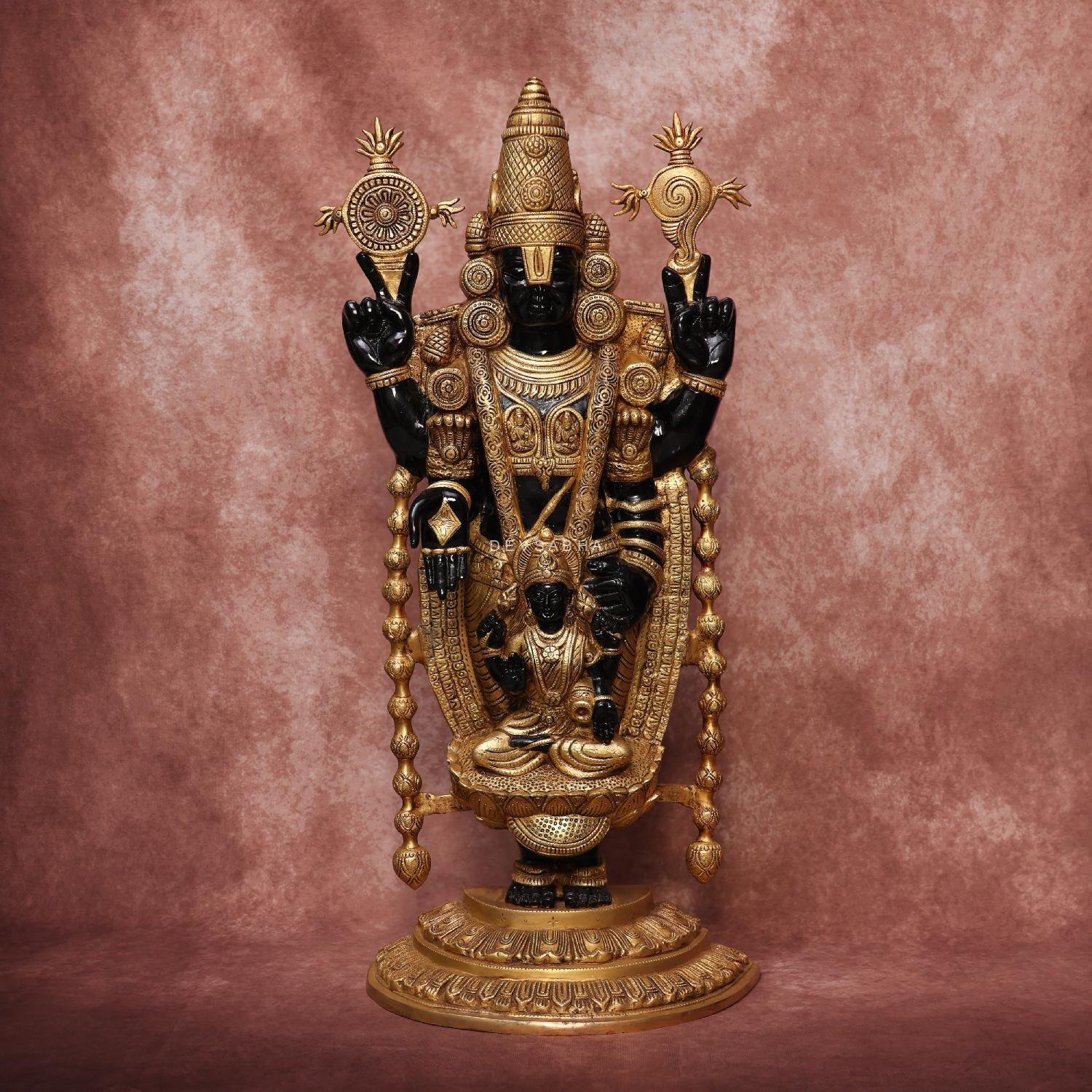 This 34.5-inch handcrafted brass Tirupati Balaji Weds Padmavati idol in a rich black finish is a magnificent depiction of divine grace and prosperity. Crafted with traditional methods and fine detailing, this brass Balaji Padmavati murti is ideal for temple sanctums, pooja spaces, or grand home décor, symbolizing devotion, wealth, and marital harmony.