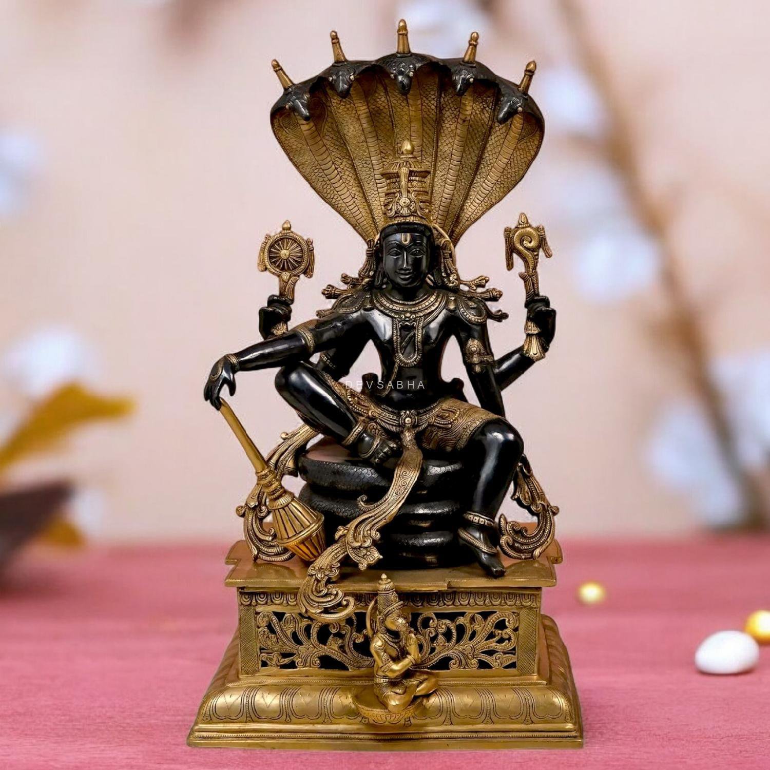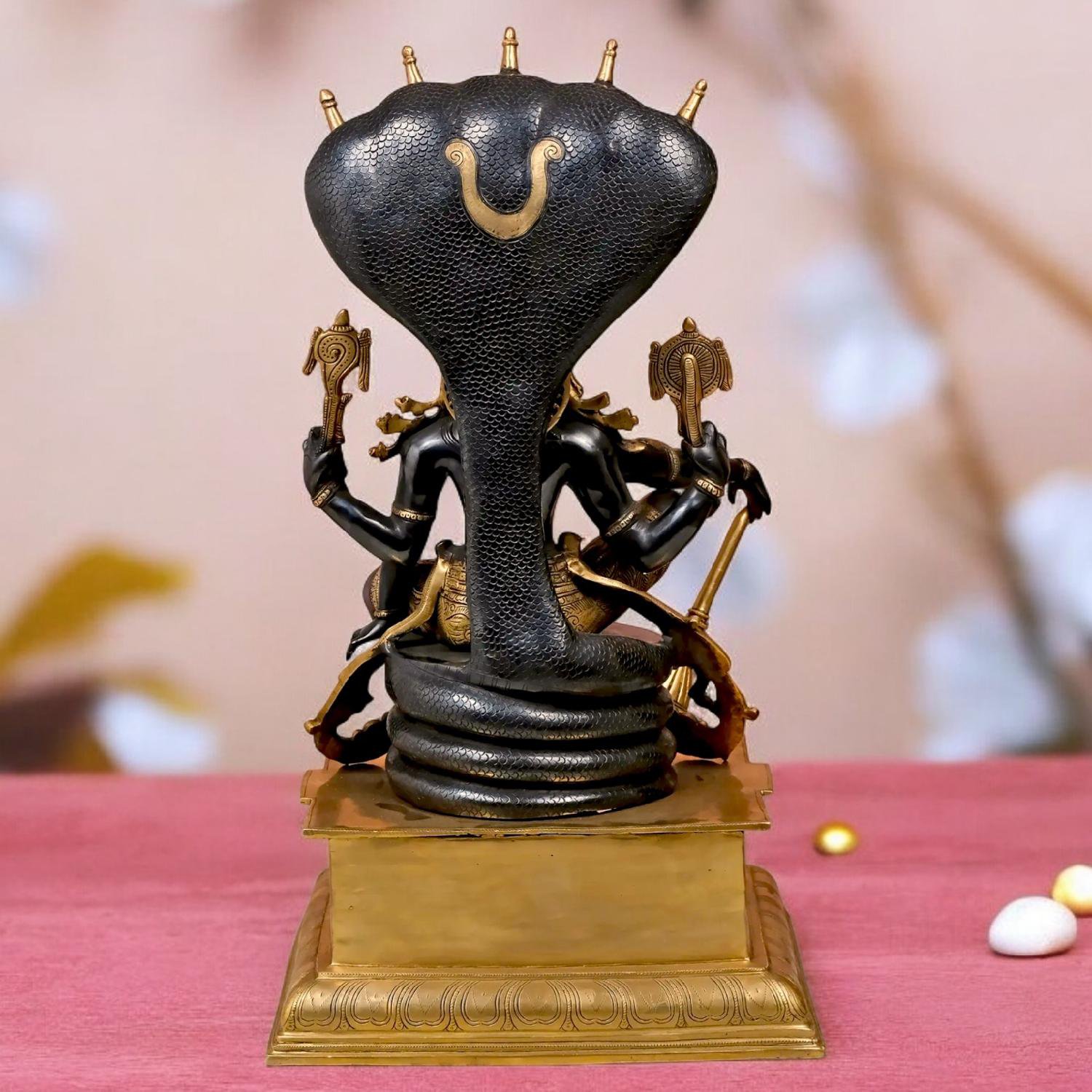 This 29-inch handcrafted brass black Vishnu idol seated on Sheshnag is a magnificent creation symbolizing divine power, protection, and cosmic balance. Made with traditional techniques and fine detailing, this brass Lord Vishnu murti in black antique finish is perfect for temples, pooja rooms, or elegant home décor.