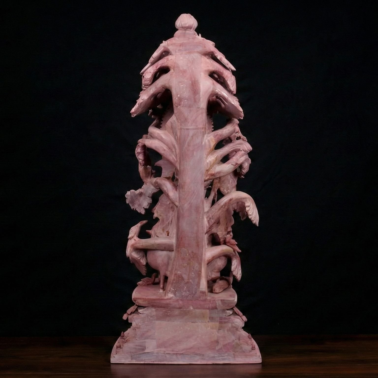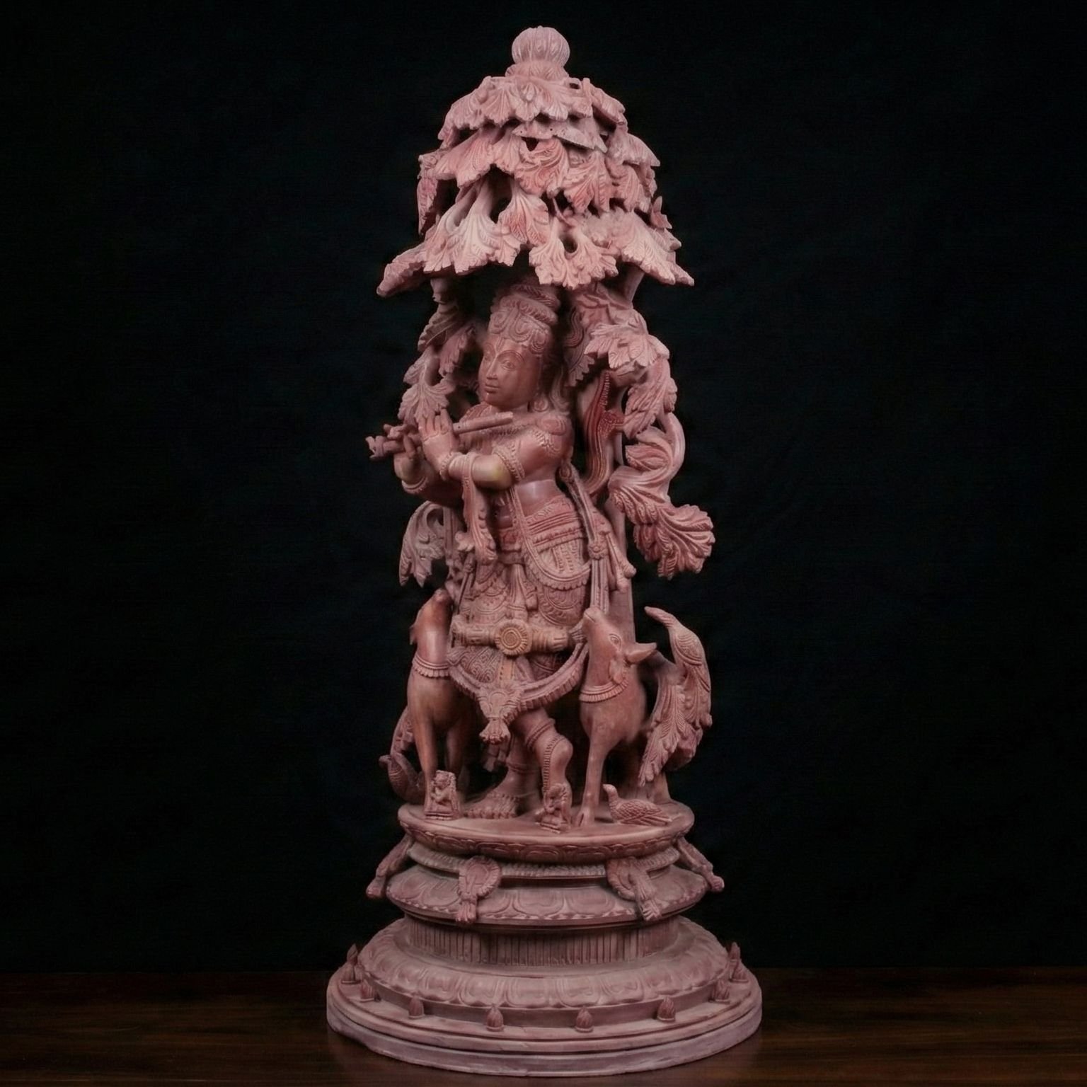 Carved from premium natural pink stone, every detail—from Krishna’s serene expression to the flowing tree branches and animal forms—is patiently hand-sculpted, reflecting exceptional craftsmanship and devotion. The natural stone ensures lifelong beauty, strength, and suitability for daily worship.