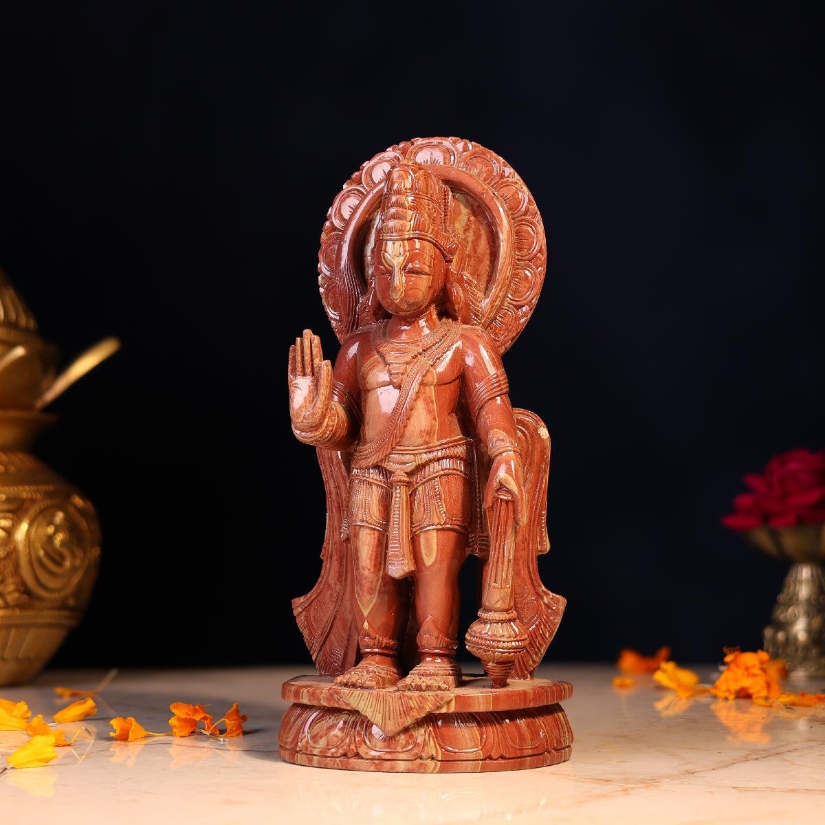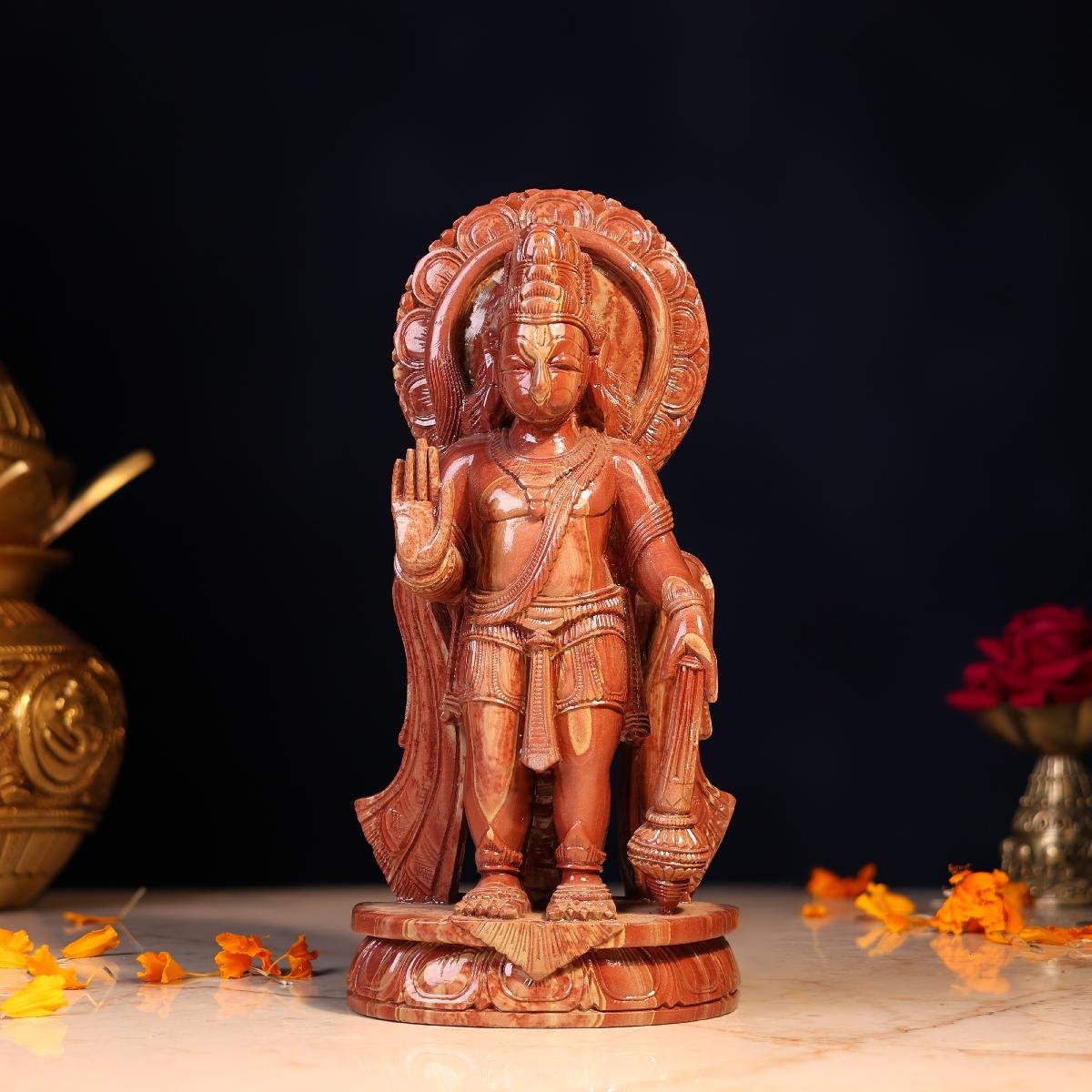 Carved from elegant pink stone, the murti features fine detailing, balanced proportions, and a serene yet commanding expression that enhances the spiritual ambiance of your home temple, pooja room, office, or meditation area. The standing form of Hanuman represents readiness to serve, strength in adversity, and protection from negative energies.